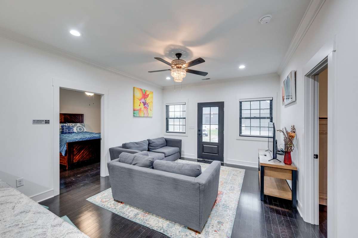 The kitchen is equipped with stainless steel appliances, a wall oven, built- in microwave, and smooth cooktop, providing both style and functionality. The open layout allows for seamless flow between living, dining, and kitchen areas, making this home ideal for a guest house, multigenerational living, or private retreat.
