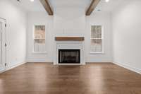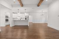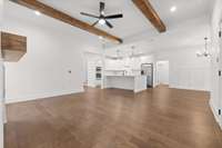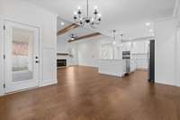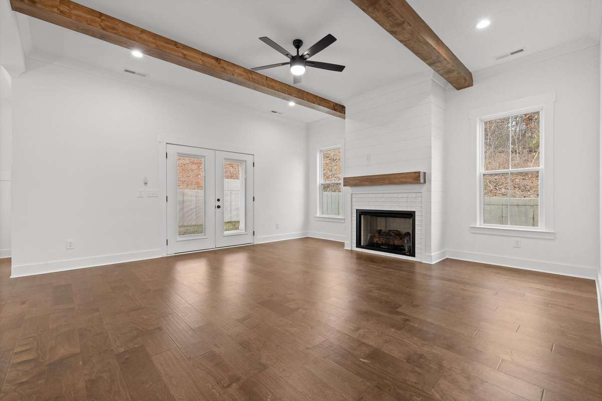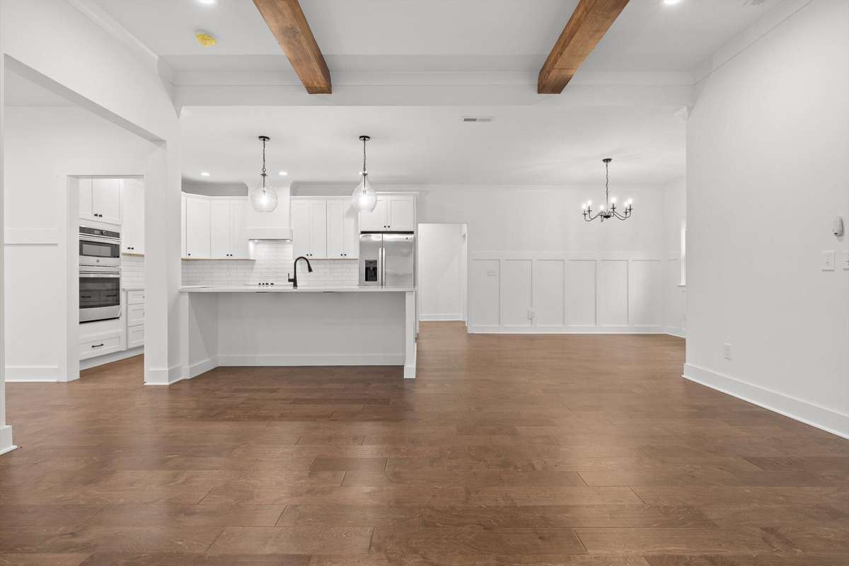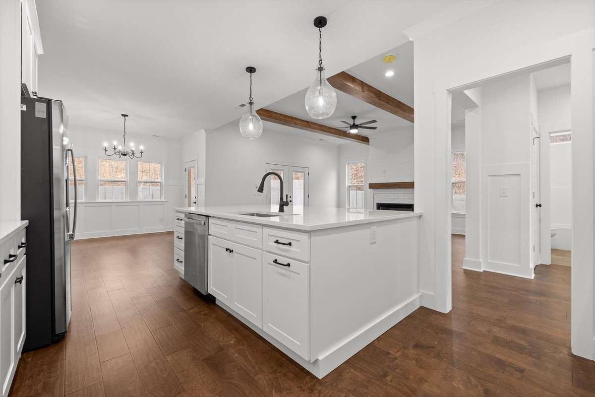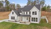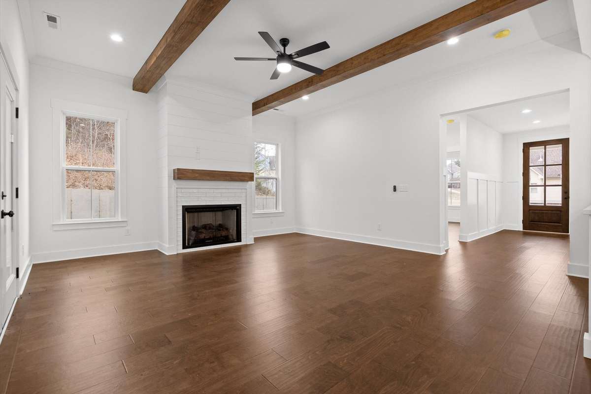 This newly built home blends timeless farmhouse charm with modern luxury finishes throughout. Step inside to a welcoming entryway with custom built- in shelving that opens into an expansive open- concept living area. Exposed beamed ceilings and a cozy gas fireplace create a warm, inviting atmosphere. The chef' s kitchen features stainless steel appliances, including a wall oven, convection oven, built- in stovetop, and a large center island—perfect for entertaining and everyday living.
