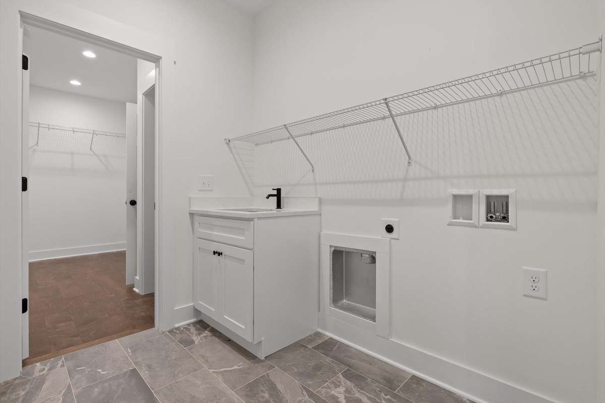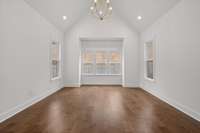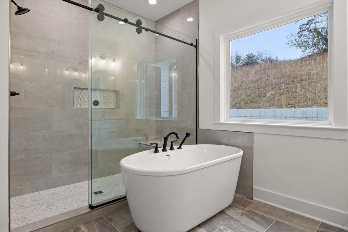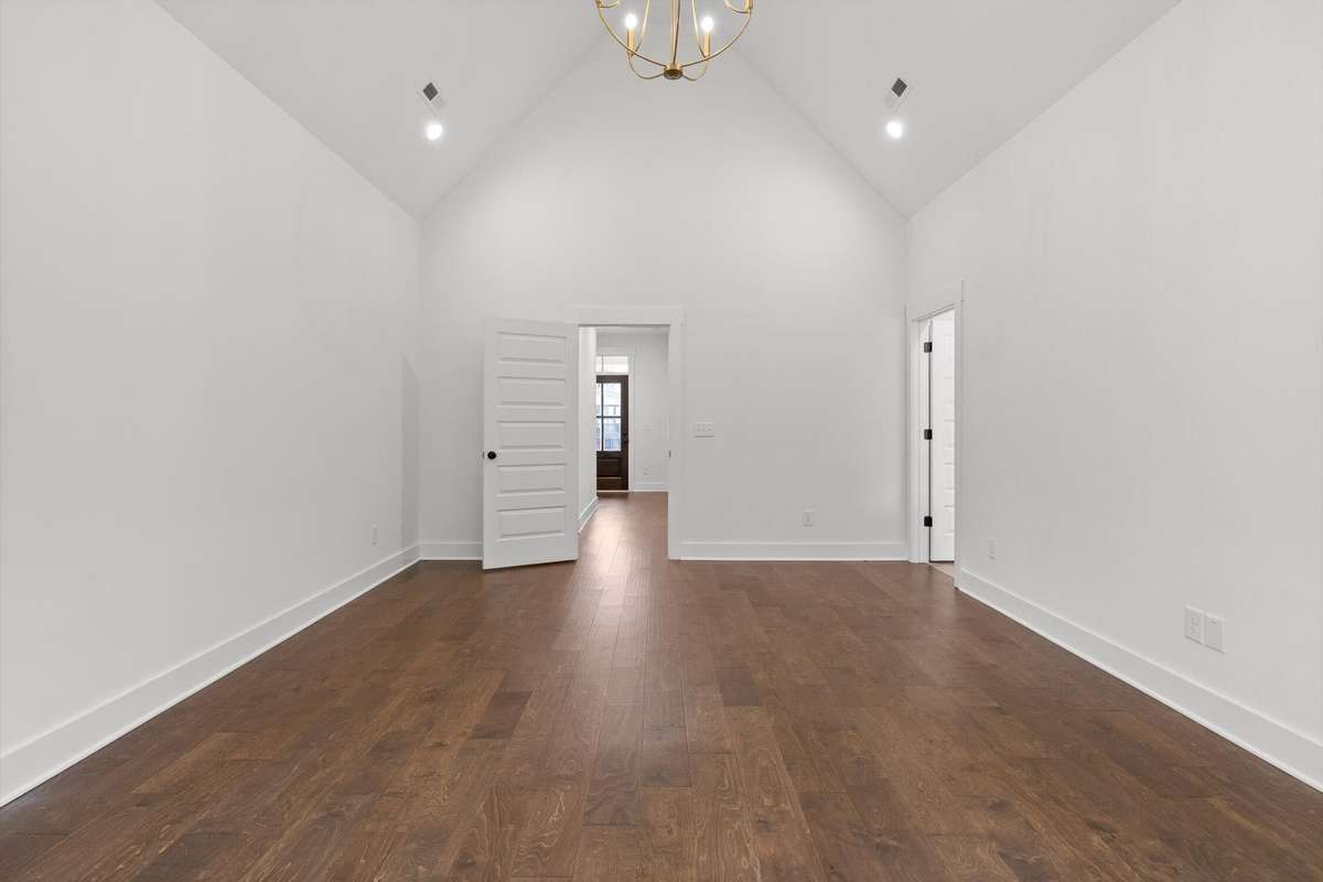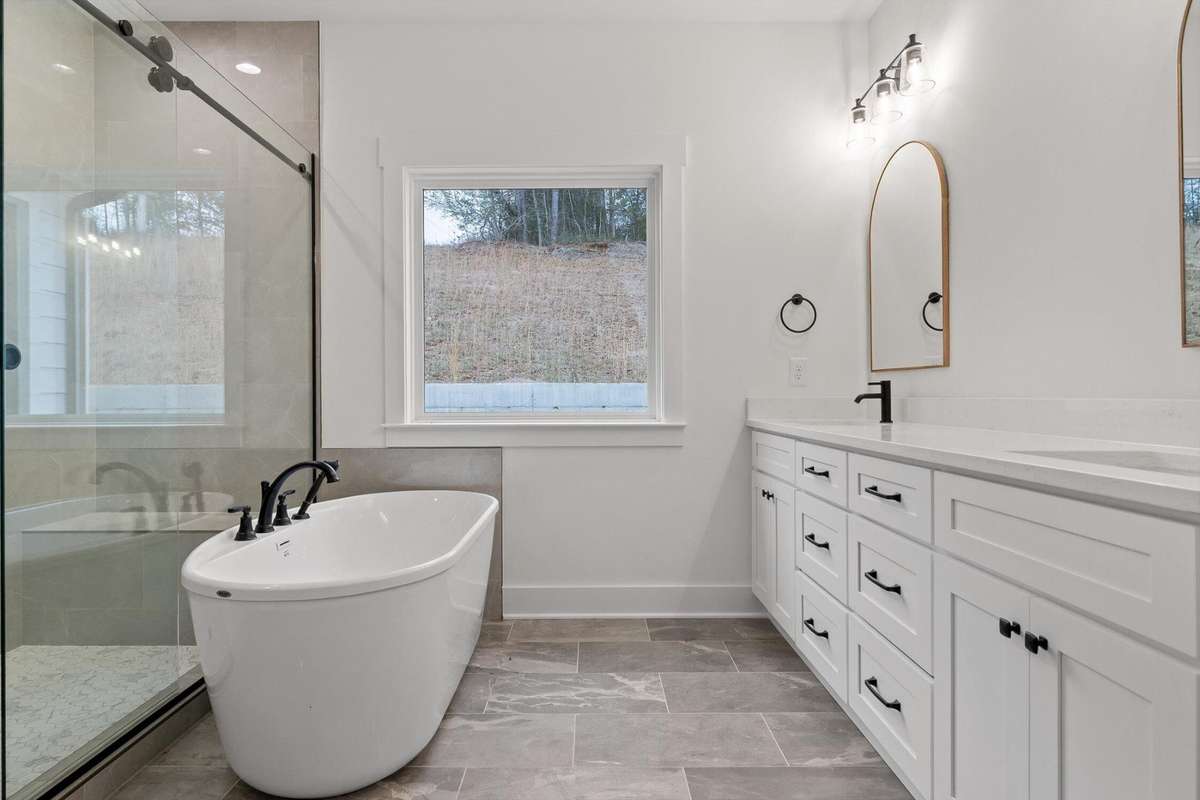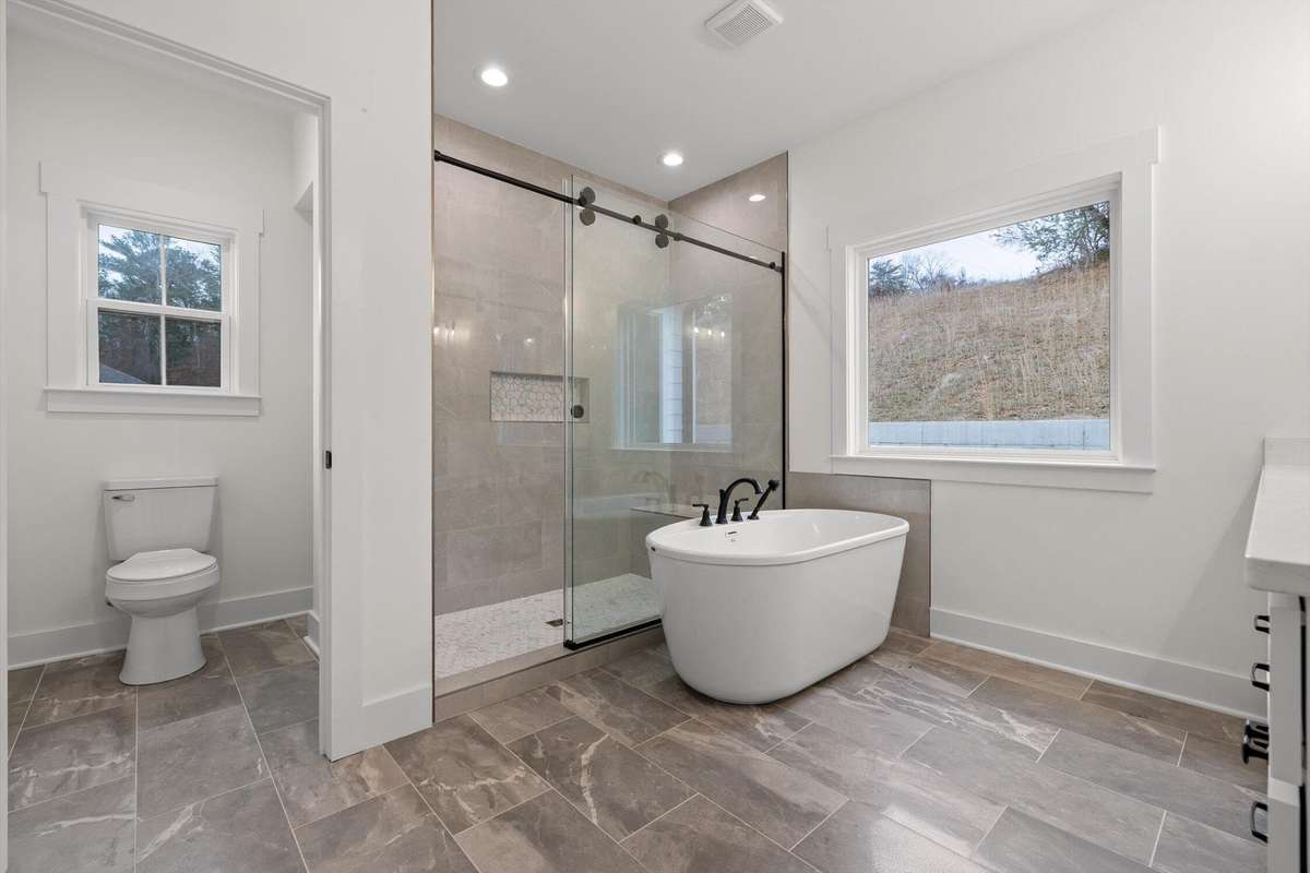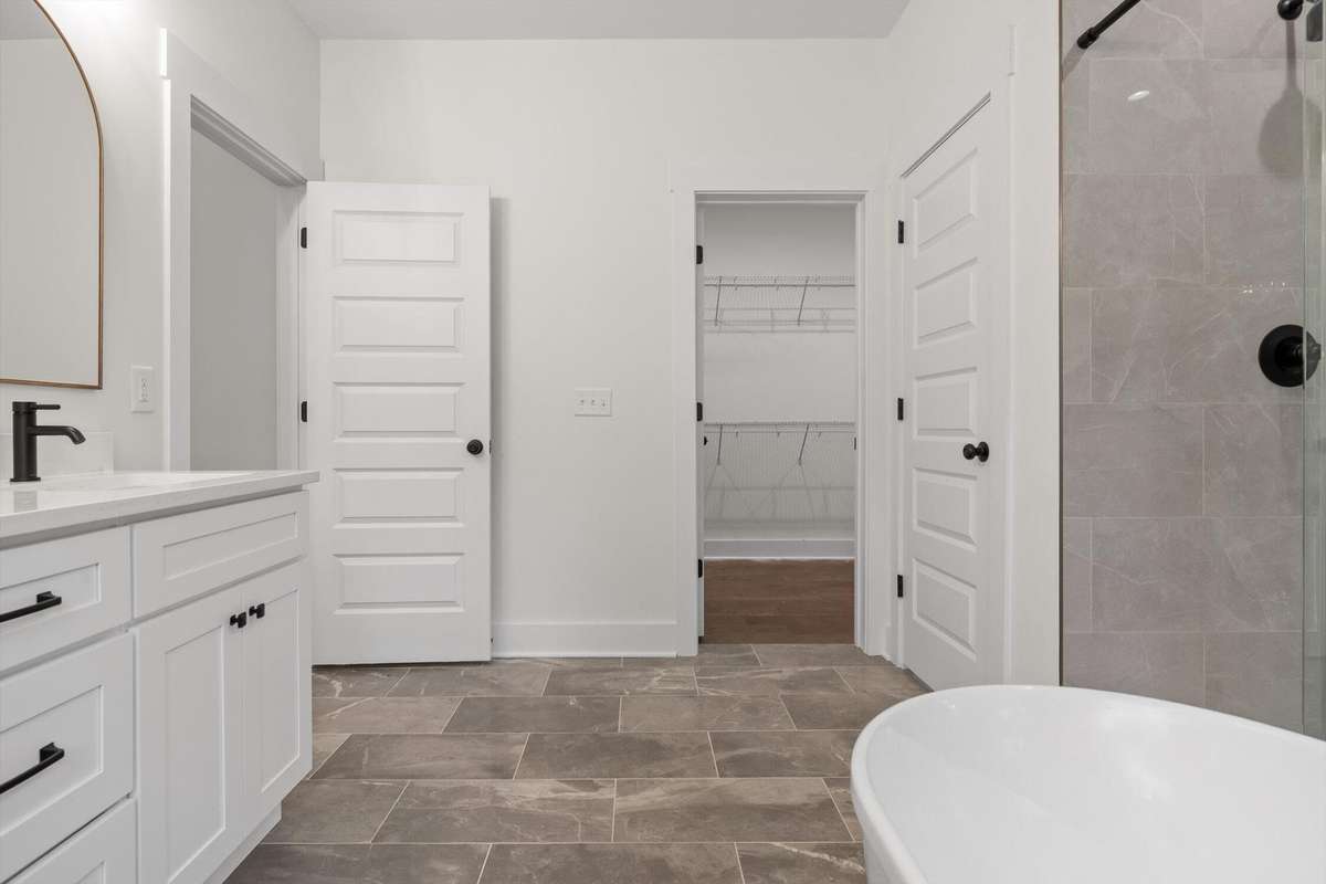 The main- level primary suite is a true retreat, showcasing a vaulted ceiling adorned with a decorative chandelier. The spa- inspired primary bathroom offers a soaking tub, oversized walk- in double shower, double vanity, and elegant finishes. A main- level laundry room with a sink adds convenience, while a private guest suite with its own bath provides flexibility for visitors, in- laws, or a home office.