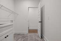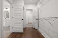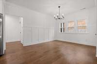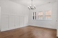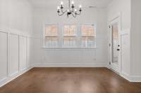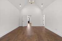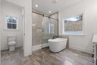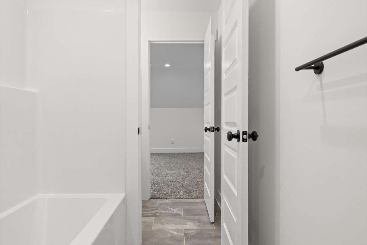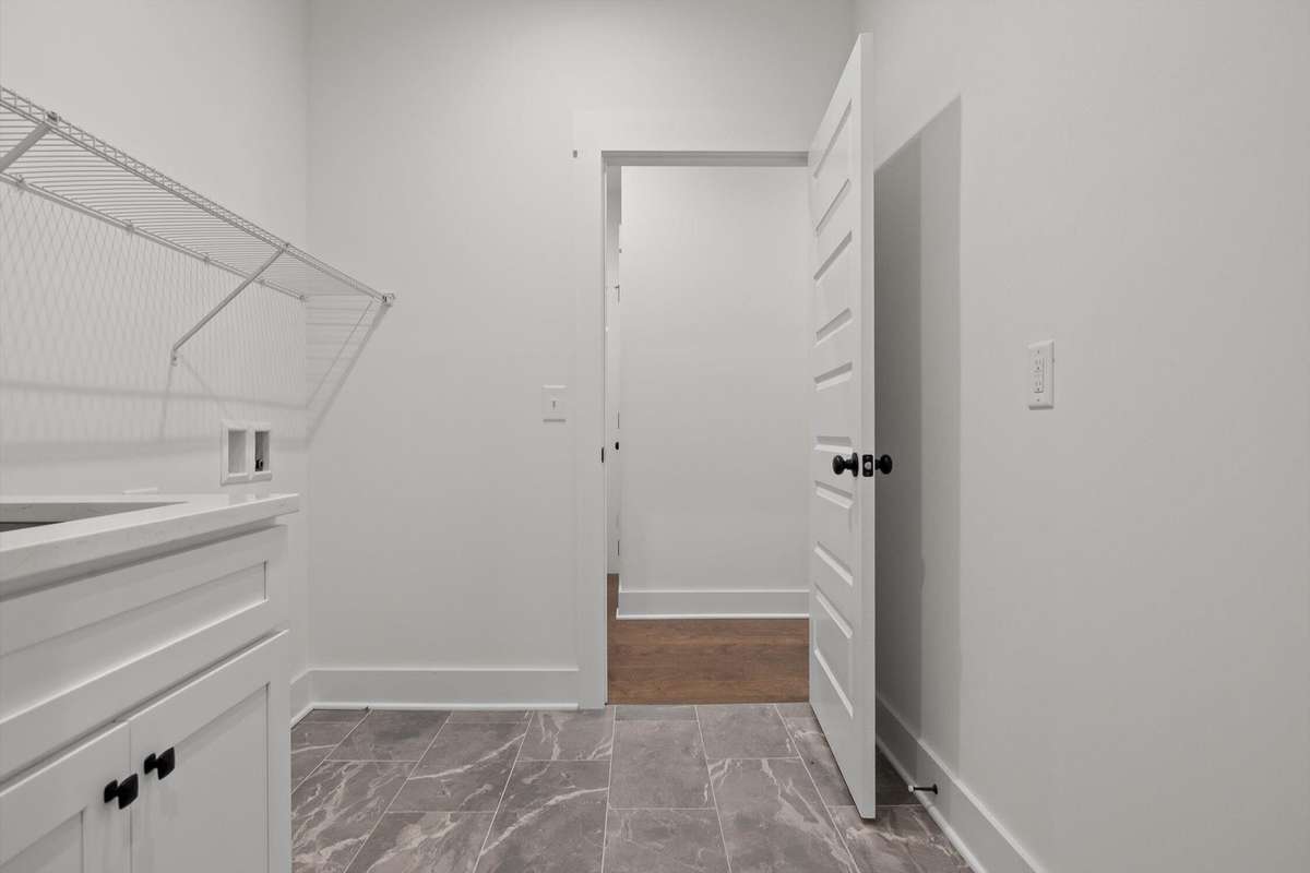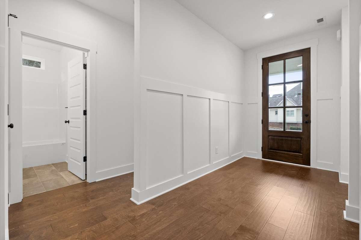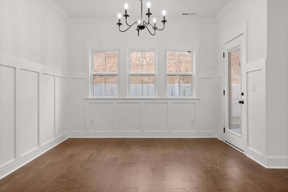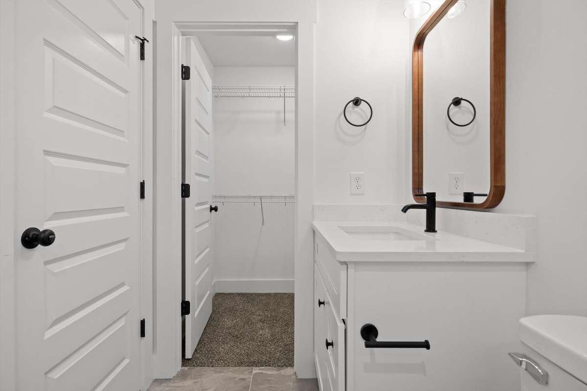 The main- level primary suite is a true retreat, showcasing a vaulted ceiling adorned with a decorative chandelier. The spa- inspired primary bathroom offers a soaking tub, oversized walk- in double shower, double vanity, and elegant finishes. A main- level laundry room with a sink adds convenience, while a private guest suite with its own bath provides flexibility for visitors, in- laws, or a home office.