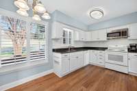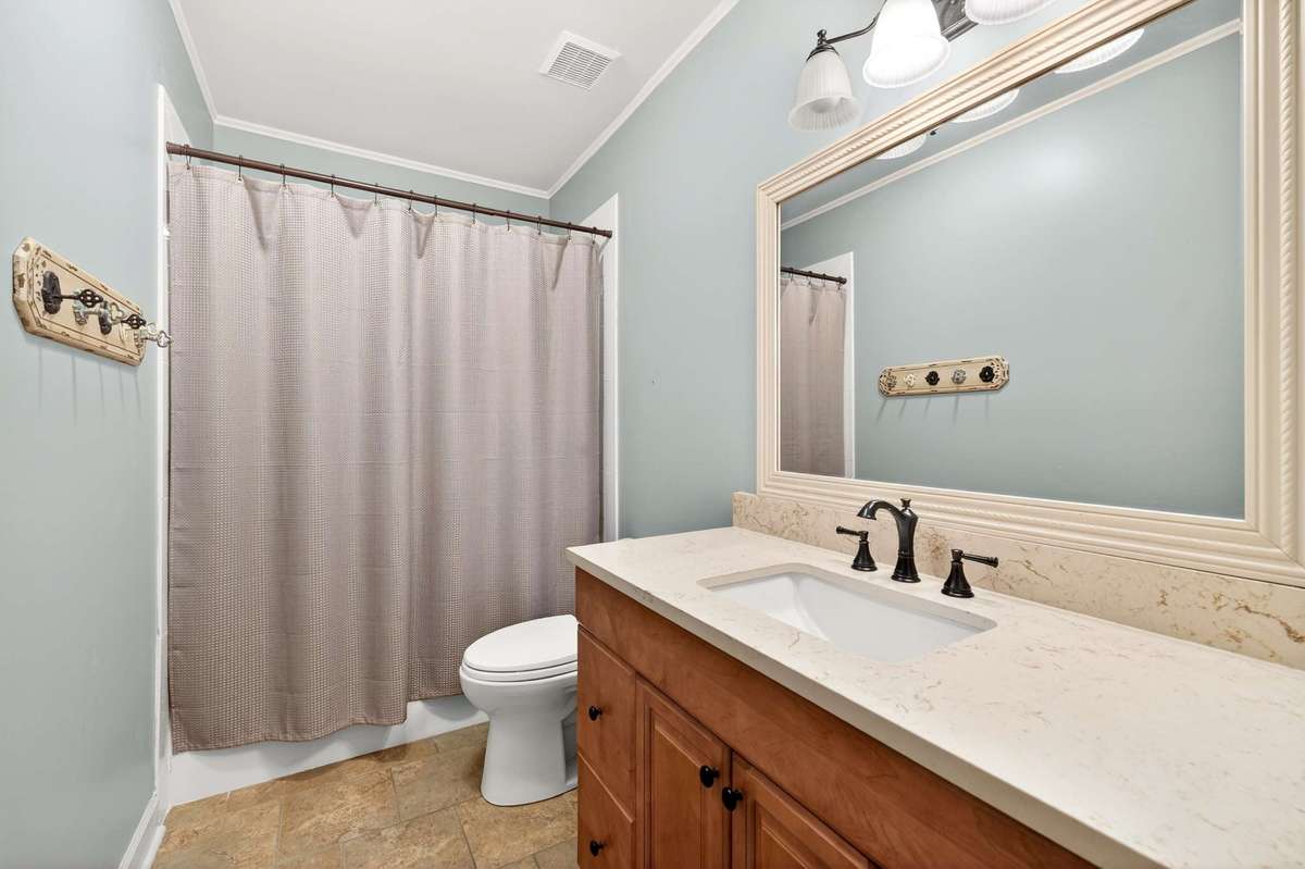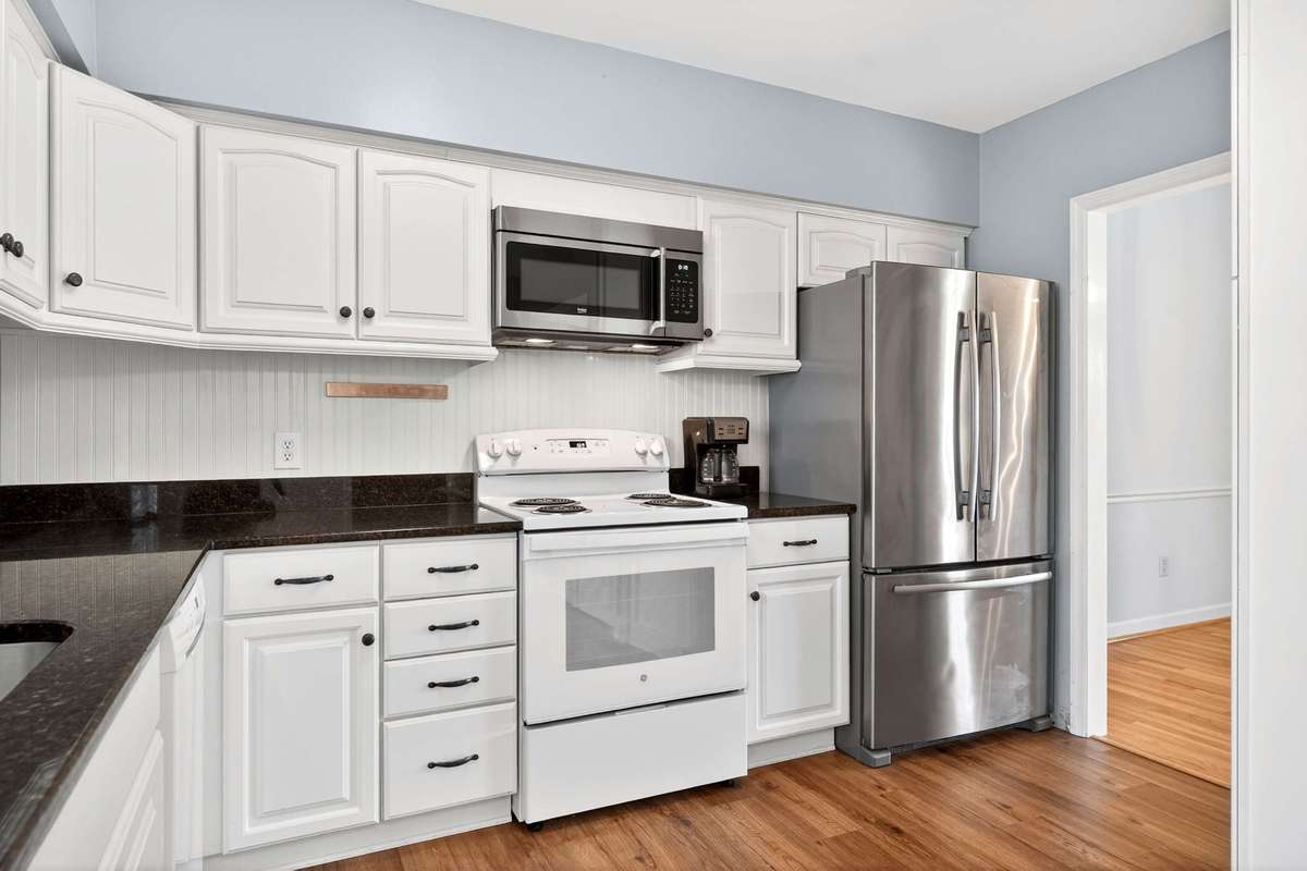 The living room features a vaulted ceiling and opens to a formal dining area with access to a private screened deck, perfect for entertaining or relaxing. The spacious owner’s suite offers trey ceilings and a well- appointed bath with double vanities.