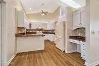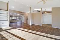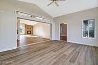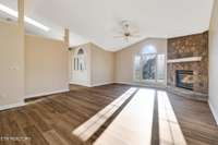 Inside, you' ll find 13- foot ceilings, a spacious open layout, and a stunning fireplace anchoring the main living area. The home features 3 bedrooms, including a luxurious primary suite with a spa- like master bath and his- and- hers walk- in closets. A dedicated office area, sunroom, and wet bar with sink provide flexible spaces for work, entertaining, or relaxation.