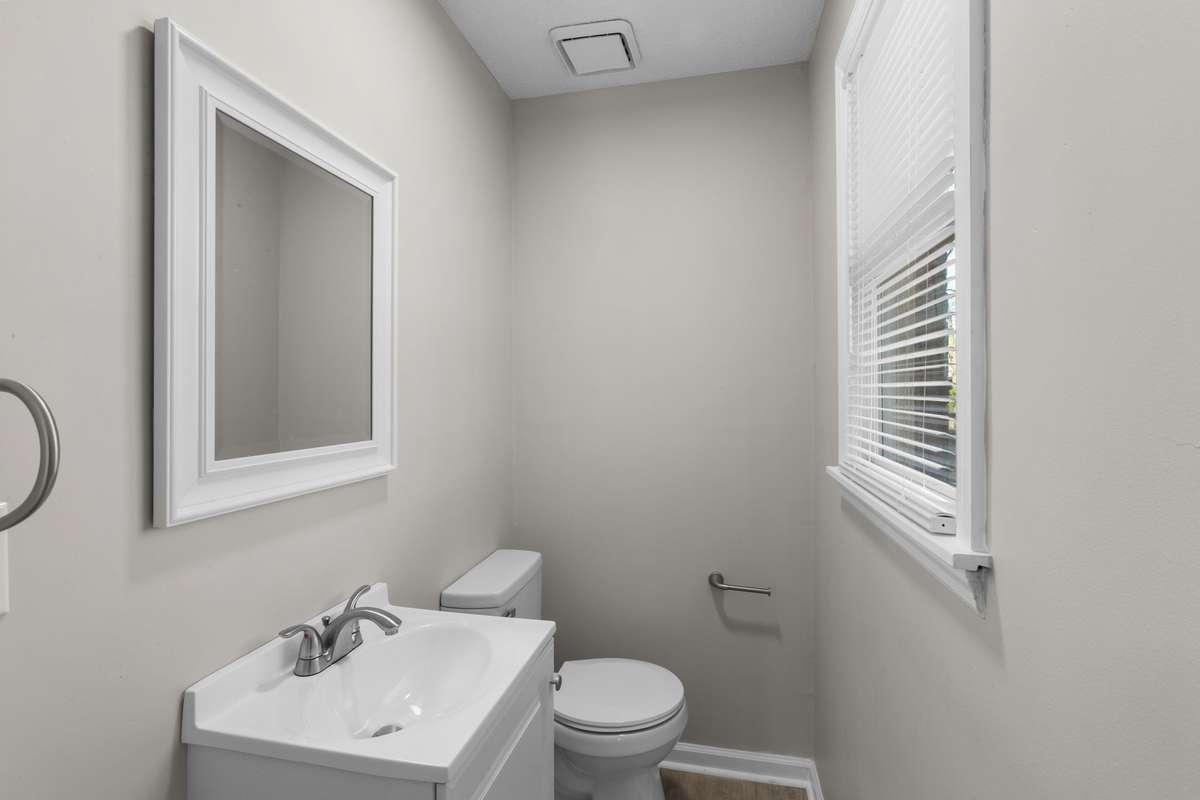 The primary bedroom includes an en suite bath with walk- in shower and walk- in closet. The second bedroom features its own en suite half bath, providing added privacy for guests or family. A full bath with tub/ shower combo with entrance from the hall serves the second and third bedroom.