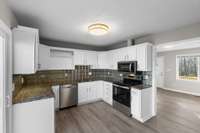 The kitchen has been refreshed with new Whirlpool appliances, including a range, dishwasher, microwave, and French- door refrigerator, and offers ample cabinetry and counter space with an easy flow into the dining area.