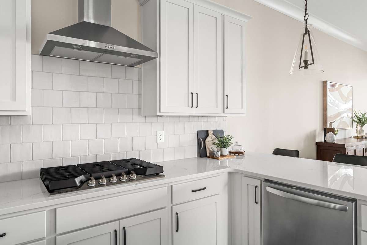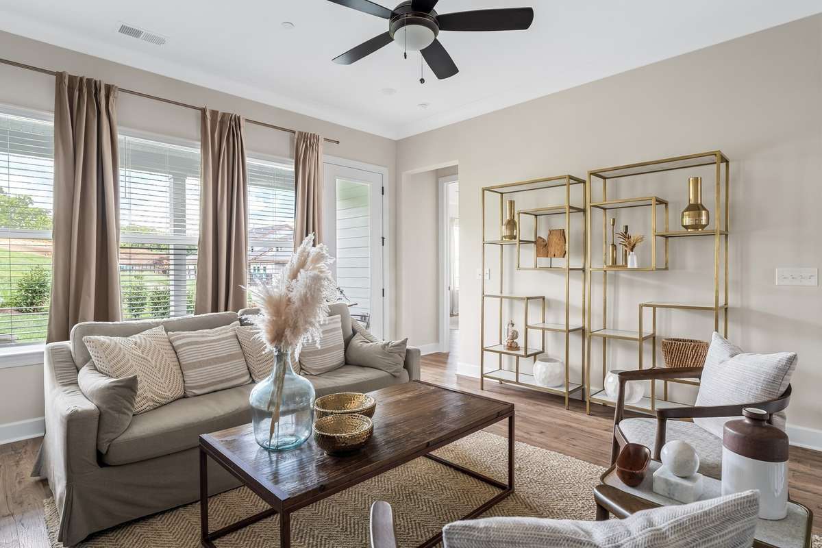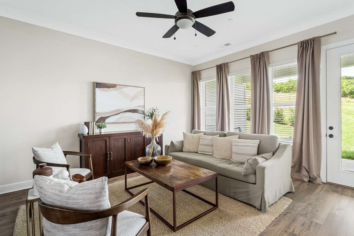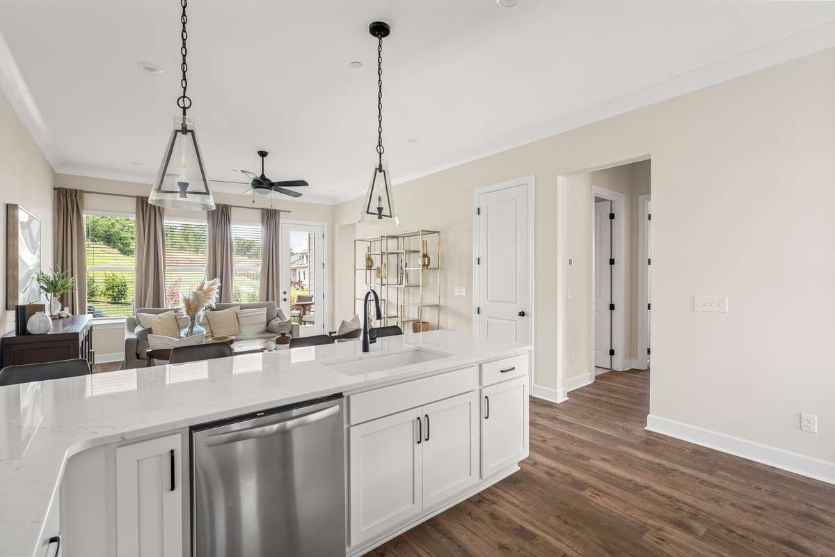 LOT 40 is beautiful Harpeth floorplan with a Media Room. The Harpeth is a designed ranch- style upstairs PLUS a finished daylight walk- out basement that adds both space and versatility. The lower level includes a spacious bedroom with a full bath, a large recreation room, and a dedicated media room—perfect for movie nights, entertaining guests, or even serving as an expansive and secure storm shelter, as it’s completely underground. On the main level, you' ll find a flexible bonus room that can be tailored to your needs—ideal as a home office, formal dining room, or creative space. Soaring 10- foot ceilings and elegant 8- foot doors throughout the home exude a sense of luxury and openness. High- end finishes abound, including quartz countertops, under- cabinet lighting, a pull- out trash drawer, stylish pendant lights, a deep single- bowl composite sink, a gas cooktop, and built- in wall oven and microwave. Hardwood floors run throughout the main level, and ceiling fans add comfort and style to each room. The thoughtfully designed laundry room makes an everyday task more enjoyable, featuring base cabinets for storage and plenty of space to stay organized. The generous primary suite offers a serene retreat with a walk- in shower, large walk- in closet, linen closet, and a separate toilet room for added privacy. Outdoor living is just as impressive, with two spacious covered back porches that invite you to enjoy your morning coffee while watching the sunrise, or relax in the evening with the sunset from your charming southern- style front porch. Finished in striking black- and- white cottage- style exteriors, The Harpeth stands out as a unique and stylish home—offering luxury, comfort, and function all in one.