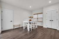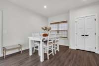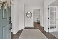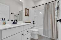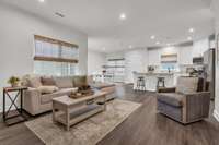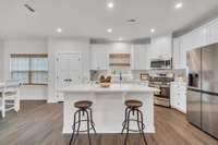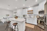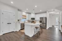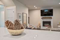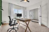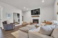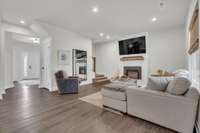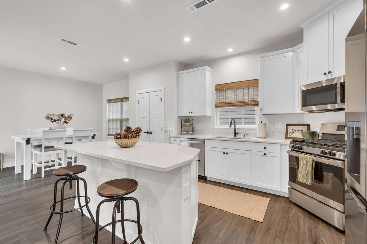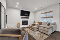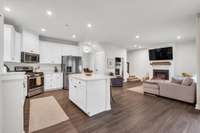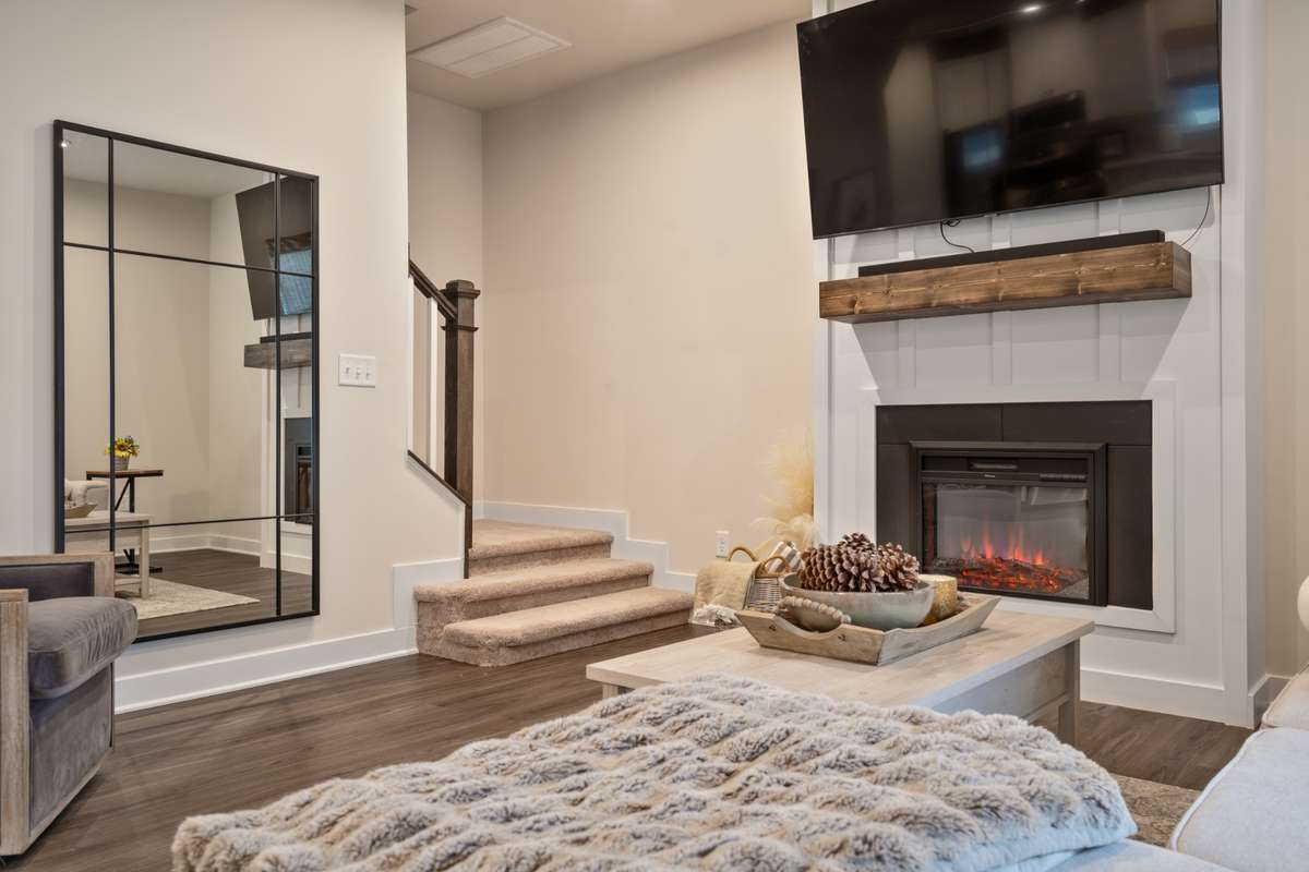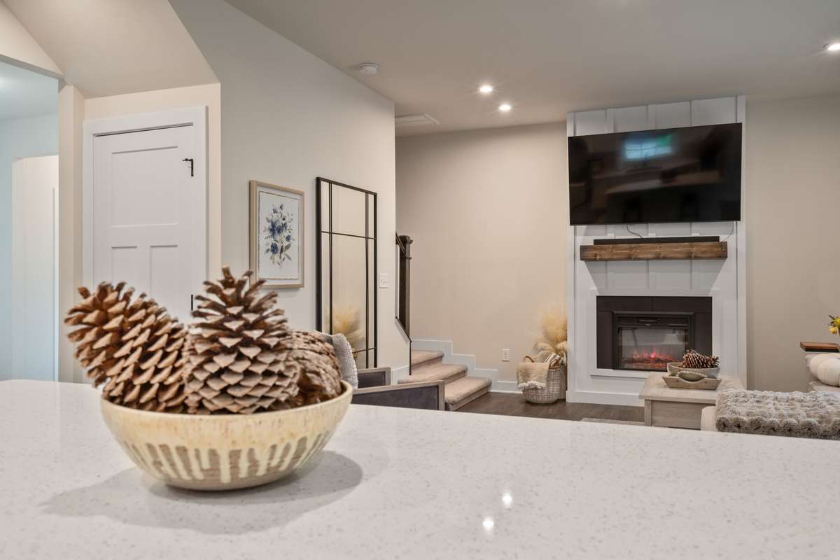 Inside, the living room becomes the heart of the home with a stunning custom fireplace accent wall that sets the tone for cozy nights and memorable gatherings. The kitchen shines with quartz countertops, upgraded white cabinetry with black hardware, luxury vinyl flooring, and a gas range that makes cooking a joy. Downstairs, the private office with glass double doors is perfect for working from home, a playroom, or a quiet reading retreat.