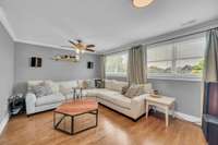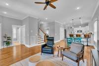 Nestled in the heart of The Nations, this beautiful home sits on an oversized lot with a meticulously maintained, fenced- in backyard featuring lush, green grass—perfect for entertaining, pets, or play. A custom enclosed screened- in porch provides a relaxing retreat, while the garage, enclosed on three sides, adds convenience and versatility.