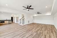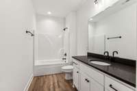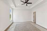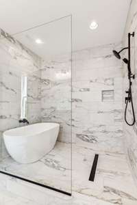 The primary suite is a true retreat with split vanities and a spacious wet- zone shower, offering both function and spa- like comfort.