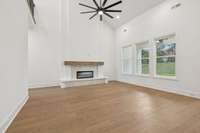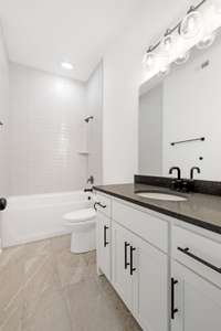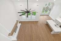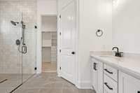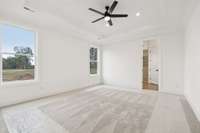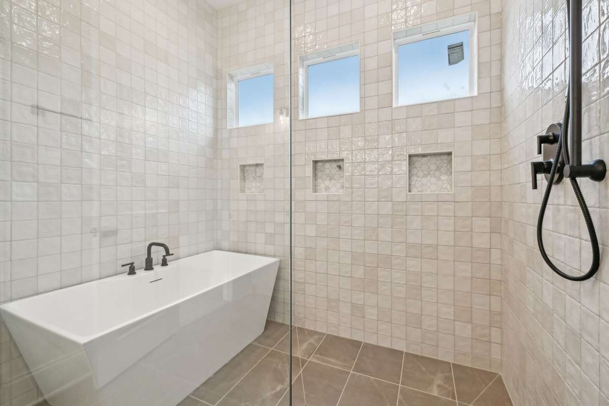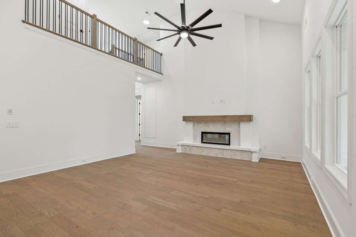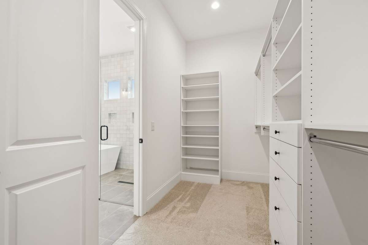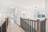 The main- level primary suite offers a spa- inspired bathroom with a luxurious wet zone, creating a relaxing retreat at the end of the day. Upstairs, an open catwalk with custom mood lighting adds character, while additional bedrooms also feature mood lighting for a warm, modern ambiance.