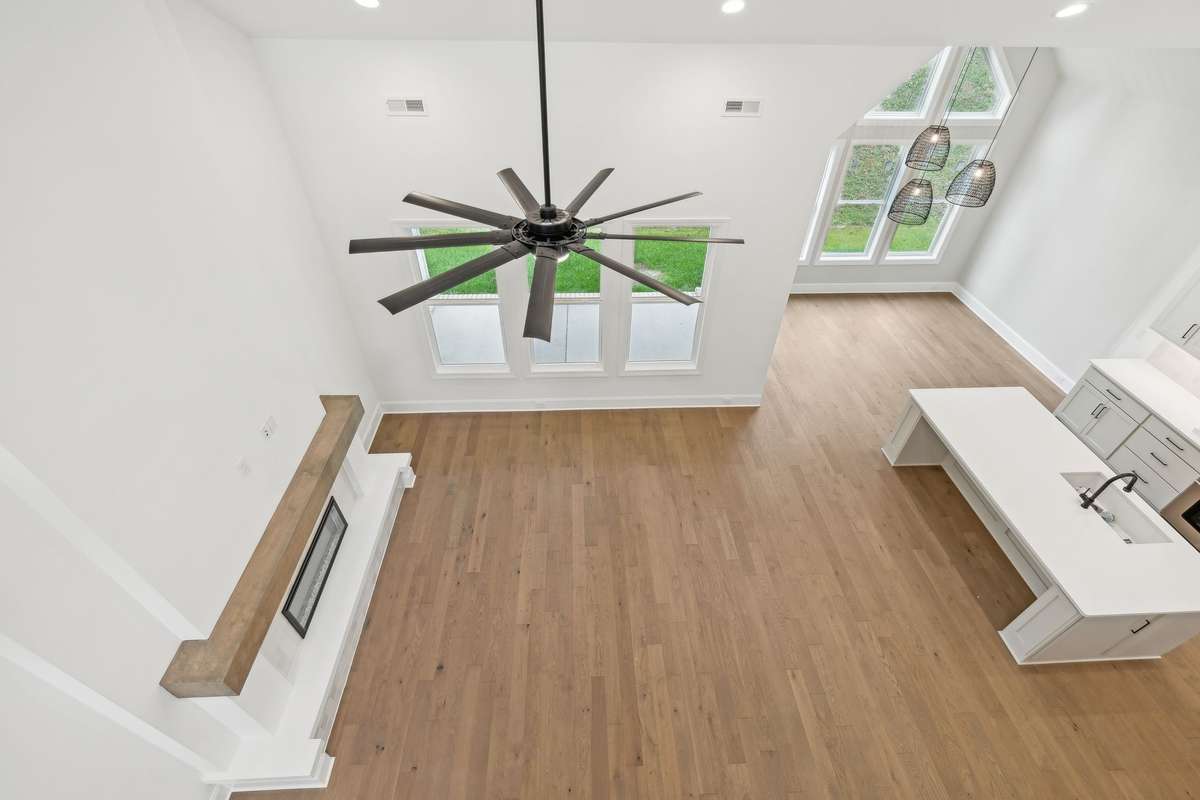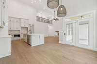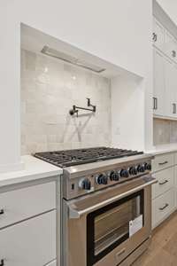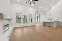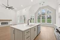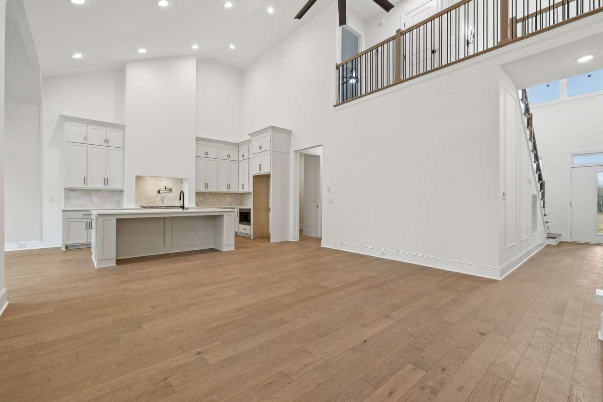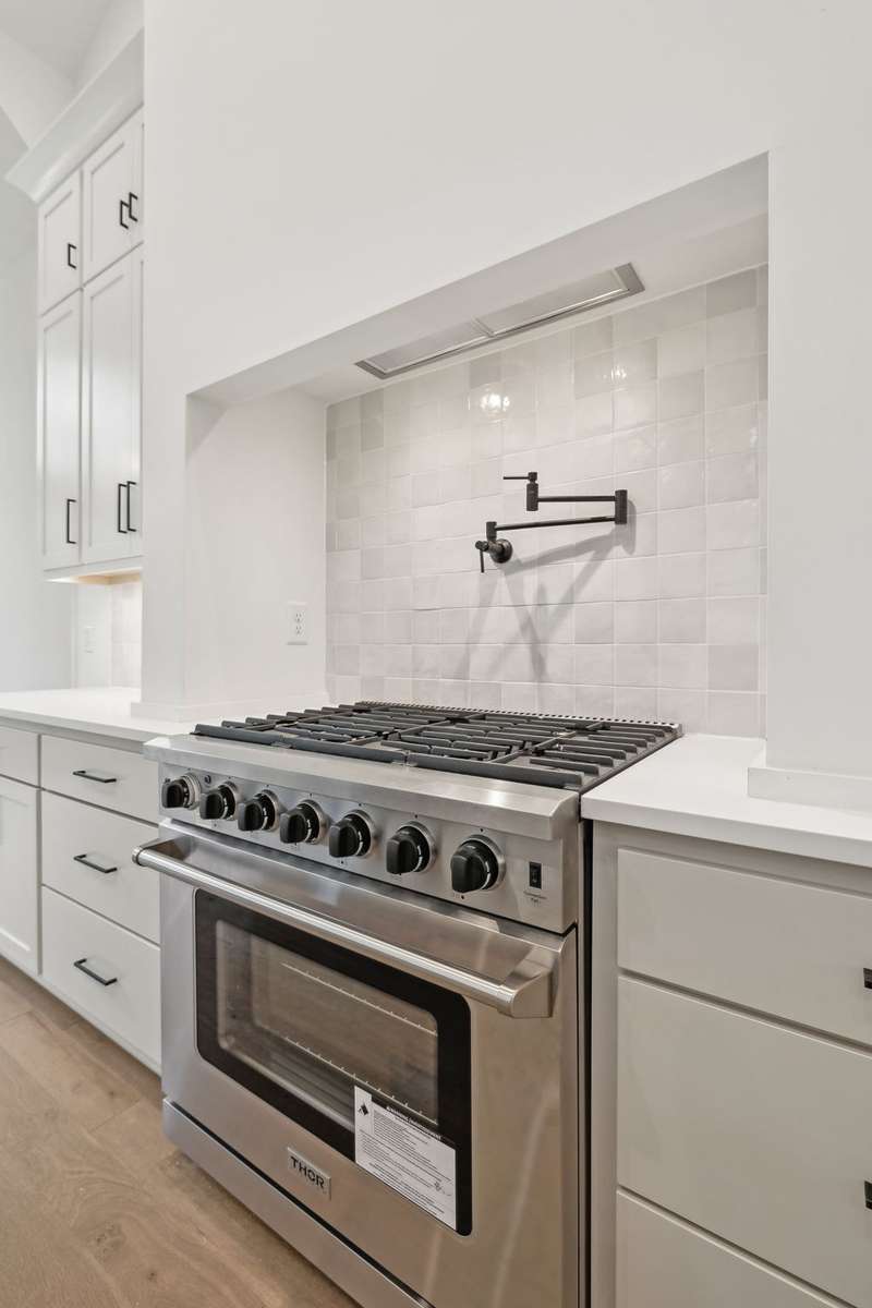The open- concept living area is accented by 10- foot ceilings and a vaulted dining space that adds architectural interest and natural light. The kitchen is a true standout, featuring a 36- inch, six- burner gas cooktop with a pot filler for added convenience, along with a massive 160- square- foot walk- in pantry complete with built- in cabinetry and countertop workspace—perfect for storage, prep, and organization.