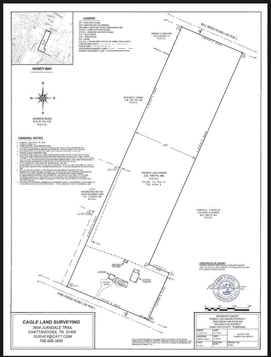 CALLING ALL INVESTORS, BUILDERS, and HOMEBUYERS! ! Auction to be held on Saturday, February 21st at 10 AM EST. This property offers a prime development and investment opportunity on 7. 62 acres in the highly desirable and rapidly growing area of Ooltewah. Conveniently located just 15 minutes from Chattanooga, 5 minutes from Collegedale, and right down the road from downtown Ooltewah, this property is close to shopping, dining, schools, and interstates. The land features a fresh survey and new general intensity soil work, with results showing strong potential for future use. Per Hamilton County, there is the potential to access sewer in the future on the backside of the property. ( Please contact Hamilton County with any questions regarding sewer projects in the area. ) The parcel includes 369 feet of road frontage on Pine Ridge Rd and an additional 270 feet of road frontage on Bill Reed Rd, offering excellent access and flexibility for development. Improvements on the tract include a well maintained 3- bedroom, 1- bathroom home with original hardwood floors, a metal roof, and a newer water heater. This property also includes a 48x25 two- bay shop, ideal for storage, business use, or personal projects. This is a rare opportunity to purchase property in a prime location with strong development potential.