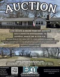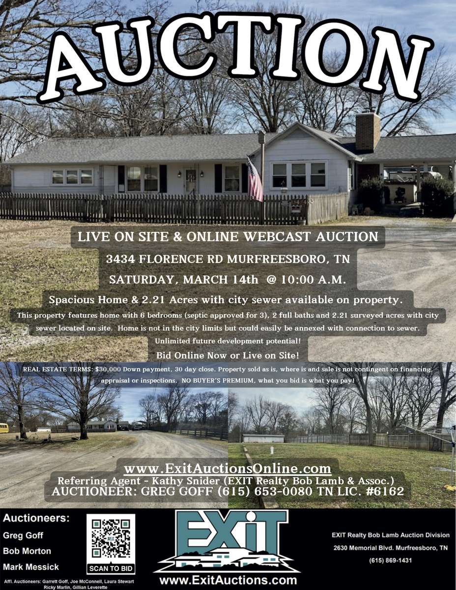 AUCTION PROPERTY! Bid online now or live on site March 14th @ 10 a. m. Actual 6 BR ( 3 BR septic approval) , 2 full bath home and 2. 21 acres with city sewer running through the property. Home is not currently in the city limits but could easily be annexed with connection to city sewer. Great future potential development. Property is sold as is, where is and sale of property is not contingent on financing, appraisal or inspections. 30 Day close.